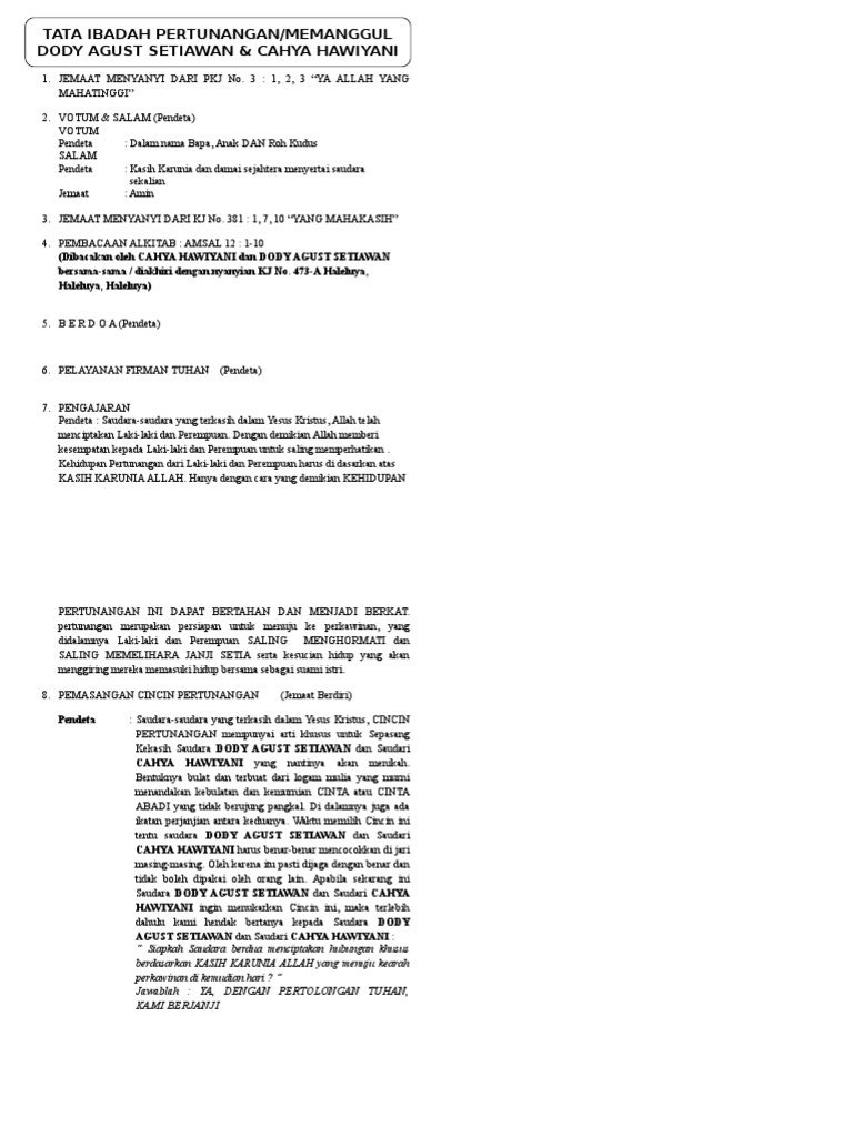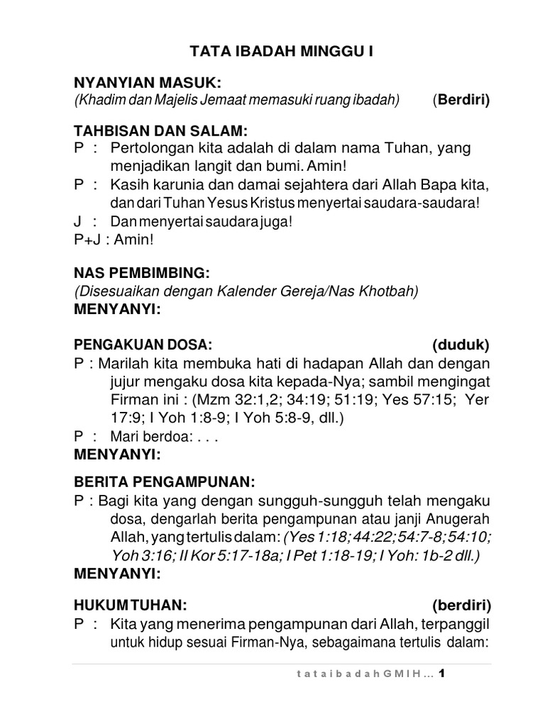 Sesungguhnya aku mengutus seorang malaikat berjalan di depanmu, untuk melindungi engkau di jalan dan untuk membawa engkau ke tempat yang telah kusediakan. Kristen adalah istilah bagi kepercayaan/iman kepada yesus kristus sebagai tuhan. Marilah ibadah ini kita khususkan dengan pengakuan: Karena melalui cara berdoa yang benar maka kehadiran karunia roh kudus akan turut menyertai jalannya ibadah sehingga sesuai dengan hikmat dan keinginan tuhan sendiri. Votum & salam pdt : Sebelum memulai ibadah ini, atas nama persekutuan anggota muda saya mengucapkan banyak terimakasih buat tuan rumah yang telah membuka pintu rumah untuk kita beribadah di tempat ini, dan terlebih lagimembukakan pintu hatinya untuk menerima kehadiran tuhan. Semoga kidung kami tak bercela. Kemuliaan bagi allah di tempat yang maha tinggi dan damai sejahtera di bumi di antara manusia yang berkenan kepadanya. Votum, salam dan pengakuan dosa harus tetap ada. Tata ibadah bulan keluarga gmit. Tata ibadah kreatif di jemaat gmim eben haezer lompad wilayah ranoiapo menurut mazmur 103 minggu, 7 agustus 2011 persiapan g syamas : Sementara dikenyataan hidup kebanyakan orang kristen mirip dengan dunia, dan terasa sulit menemukan perbedaannya, kecuali agama dan ritualnya. Pengakuan dosa, pemberitaan anugerah dan hokum 4.